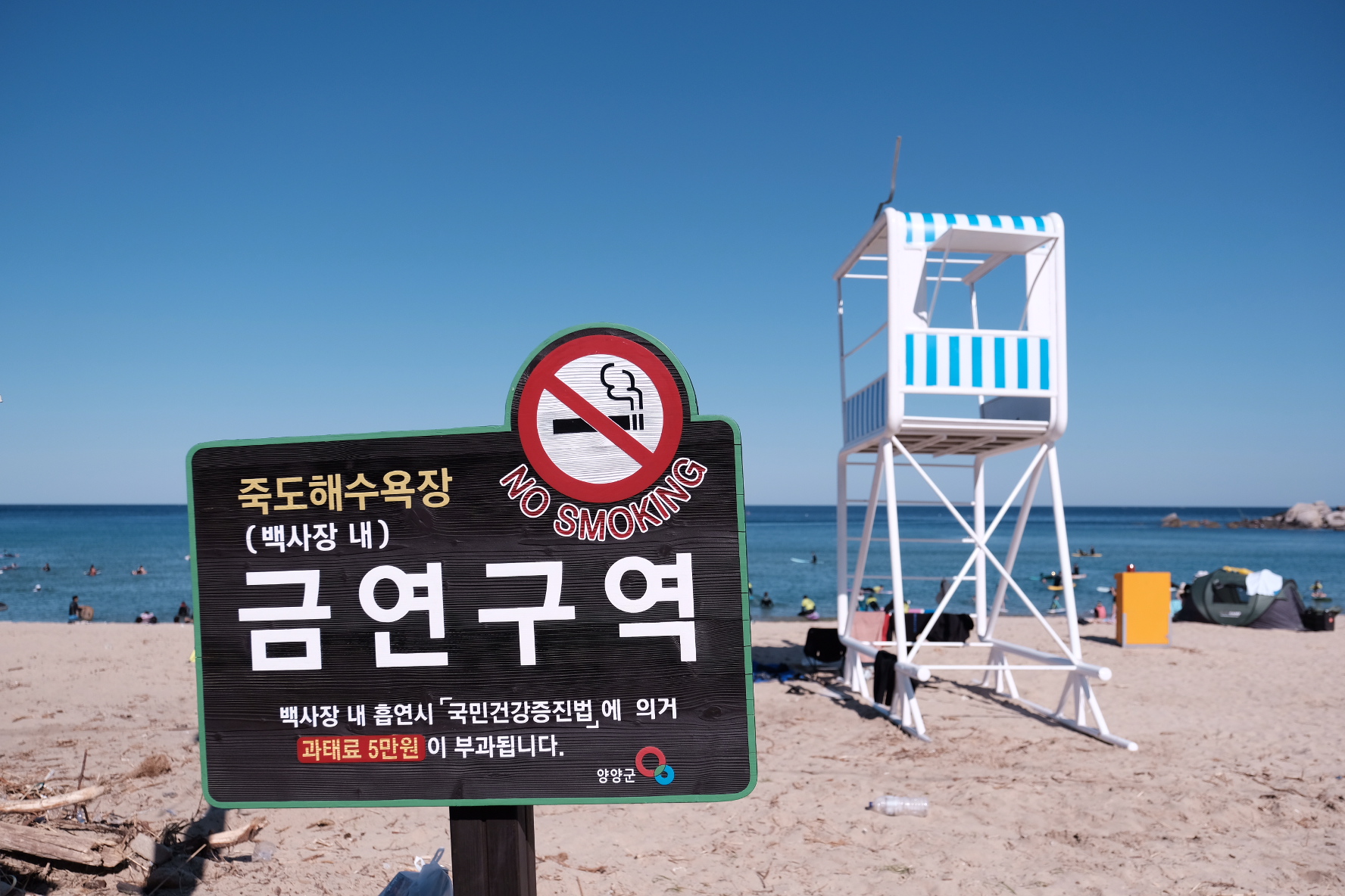 죽도 해수욕장은 금연구역입니다 :) 표지판도 참 센스있고 예쁘게 잘 만들었더라구요. 해변가를 따라서 공사 중인 건물도 많고, 표지판이나 주차장, 화장실 등 공용시설들도 나름 새 것 같아 보였어요. 양양 고속도로가 뚫리면서 양양도 많이 개발되는 것 같습니다.