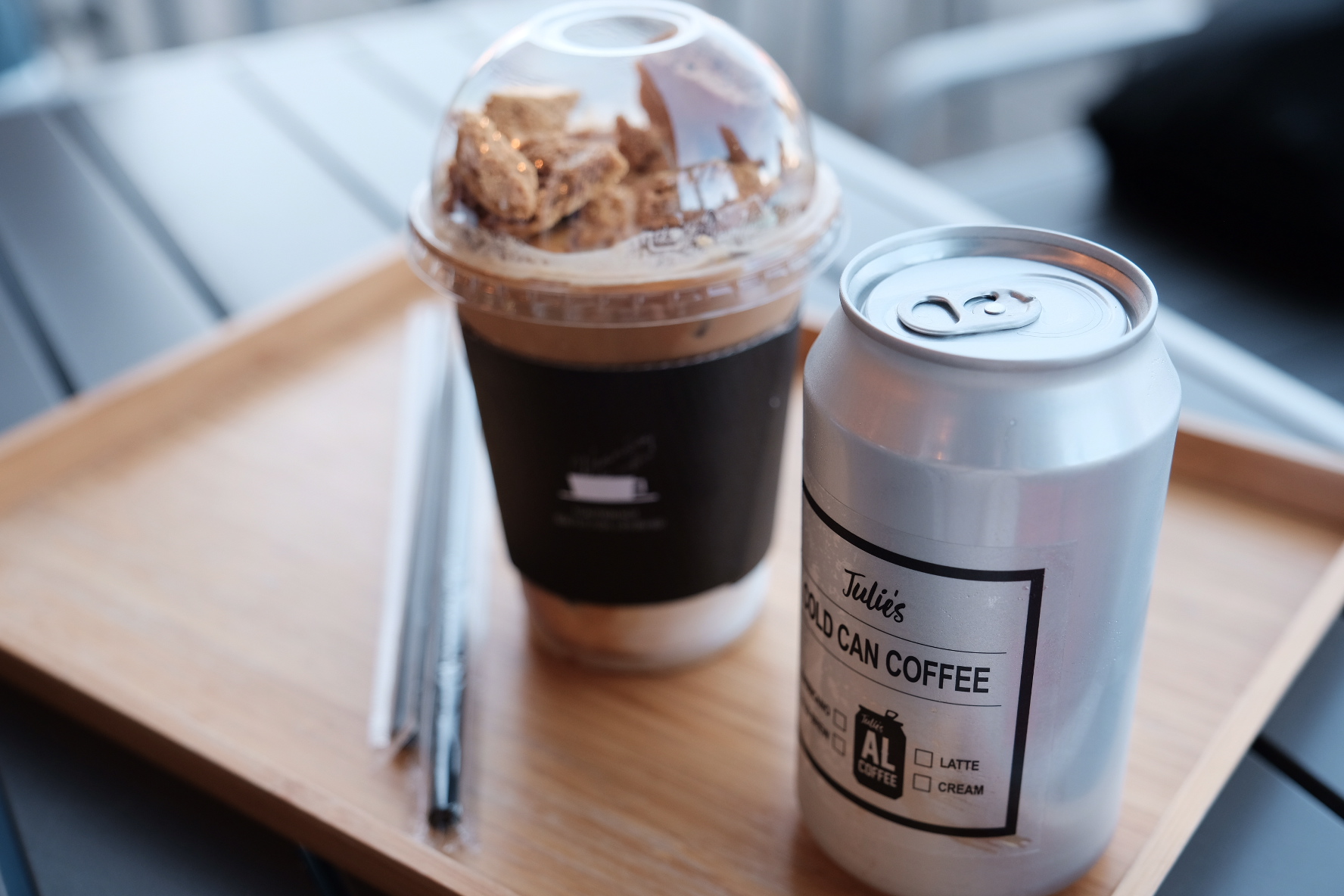 아메리카노는 캔에 담겨 나오더라구요. 신기하게도 안에 얼음도 들어있고요. 저는 달달구리한게 땡겨서 달고나 라떼를 주문했는데, 안에 달고나가 잔뜩 들어있었어요! 아메리카노는 5,000원으로 관광지를 감안하더라도 괜찮은 가격인 것 같습니다.