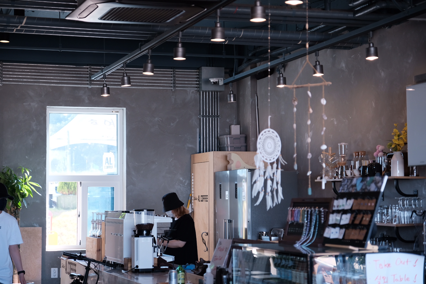 걷다 보니 커피가 한 잔 마시고 싶어서 눈에 띄는 카페에 들어갔습니다. 카페 이름은 쥴리스 알커피 (Julie's AL COFFEE)입니다. 가게는 전면 오픈되어 있지만 코로나 예방차원에서 실내 취식은 불가하고, 가게 앞쪽 야외 데크에 있는 테이블만 이용 가능합니다.