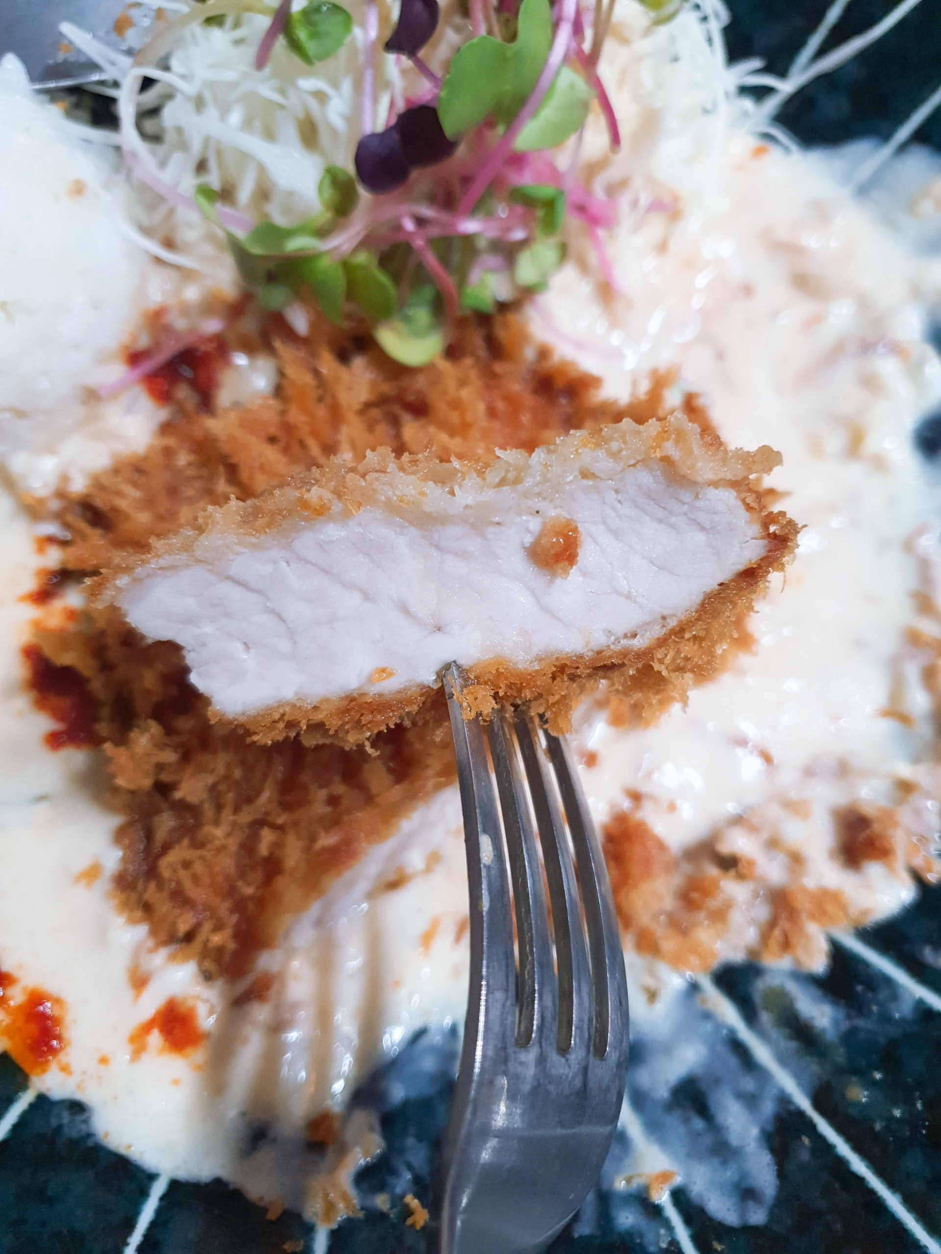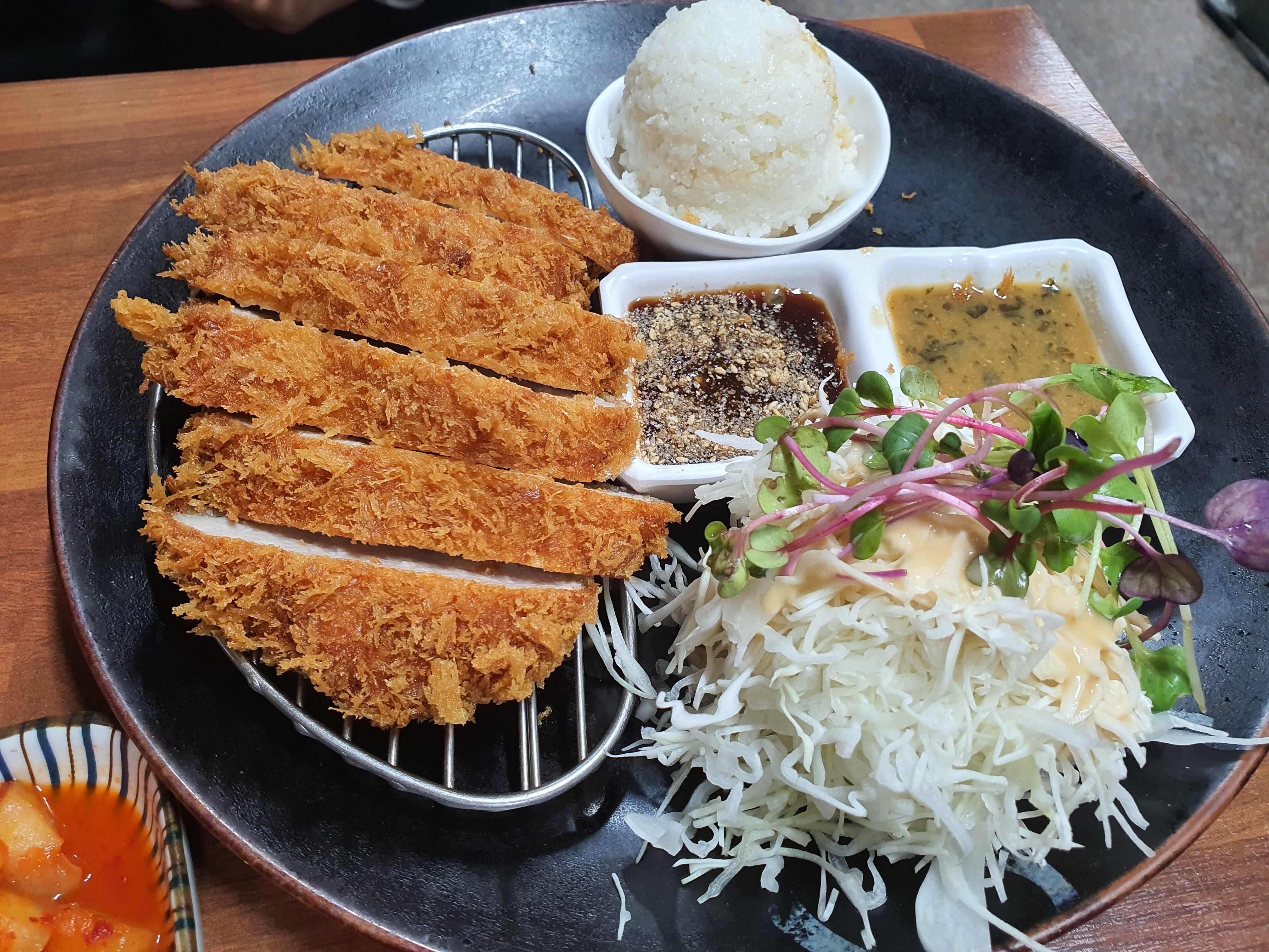 매콤크림 돈까스는 크림에 매운 맛을 섞어서 느끼하지 않고 맛있습니다. 처음 매콤크림 돈까스를 먹었을 때는 너무 매웠는데, 지금은 적당히 매운 맛으로 바뀌었네요. 3년 정도 지나니 맛이 안정화 된 것 같아요.