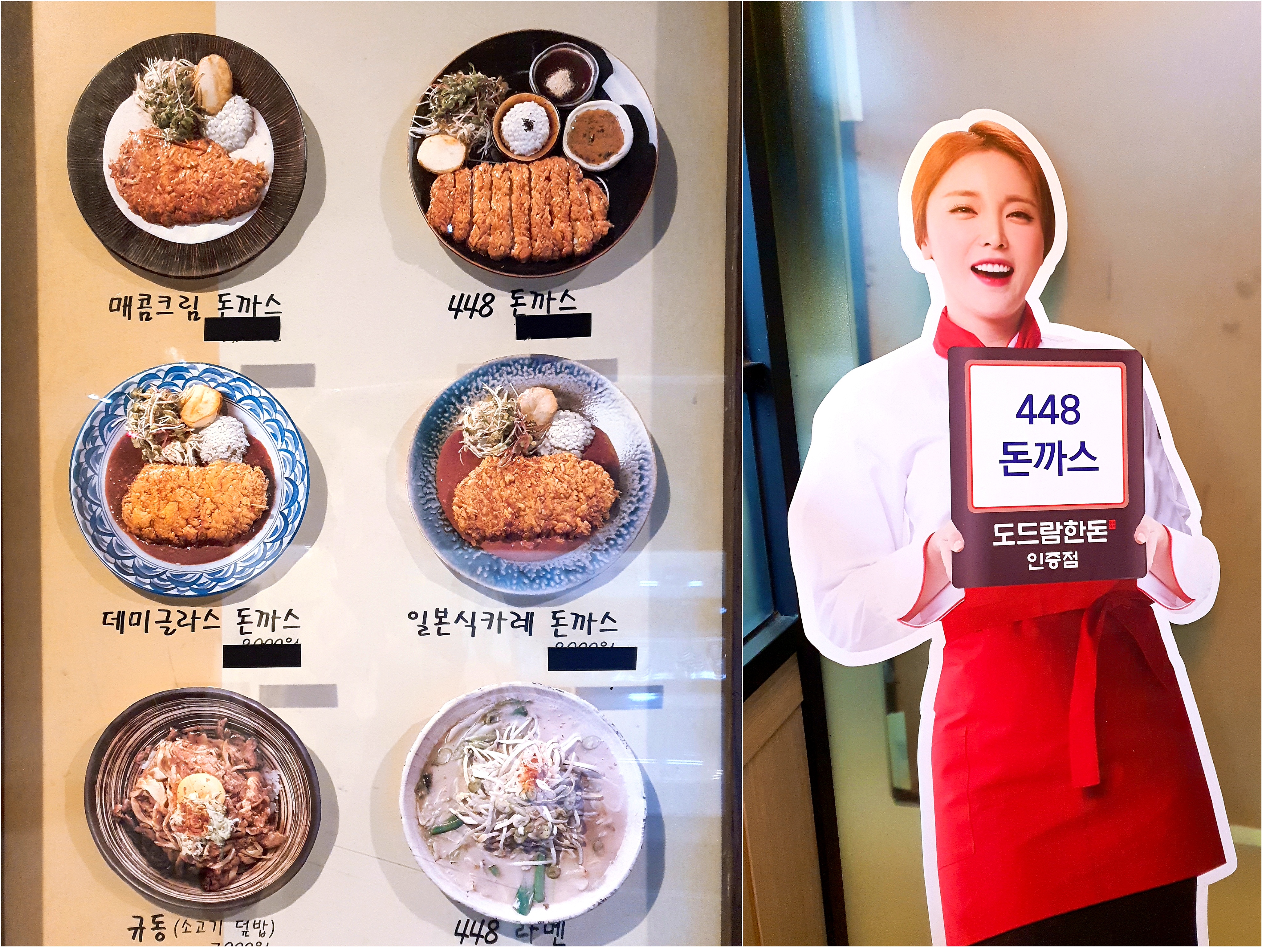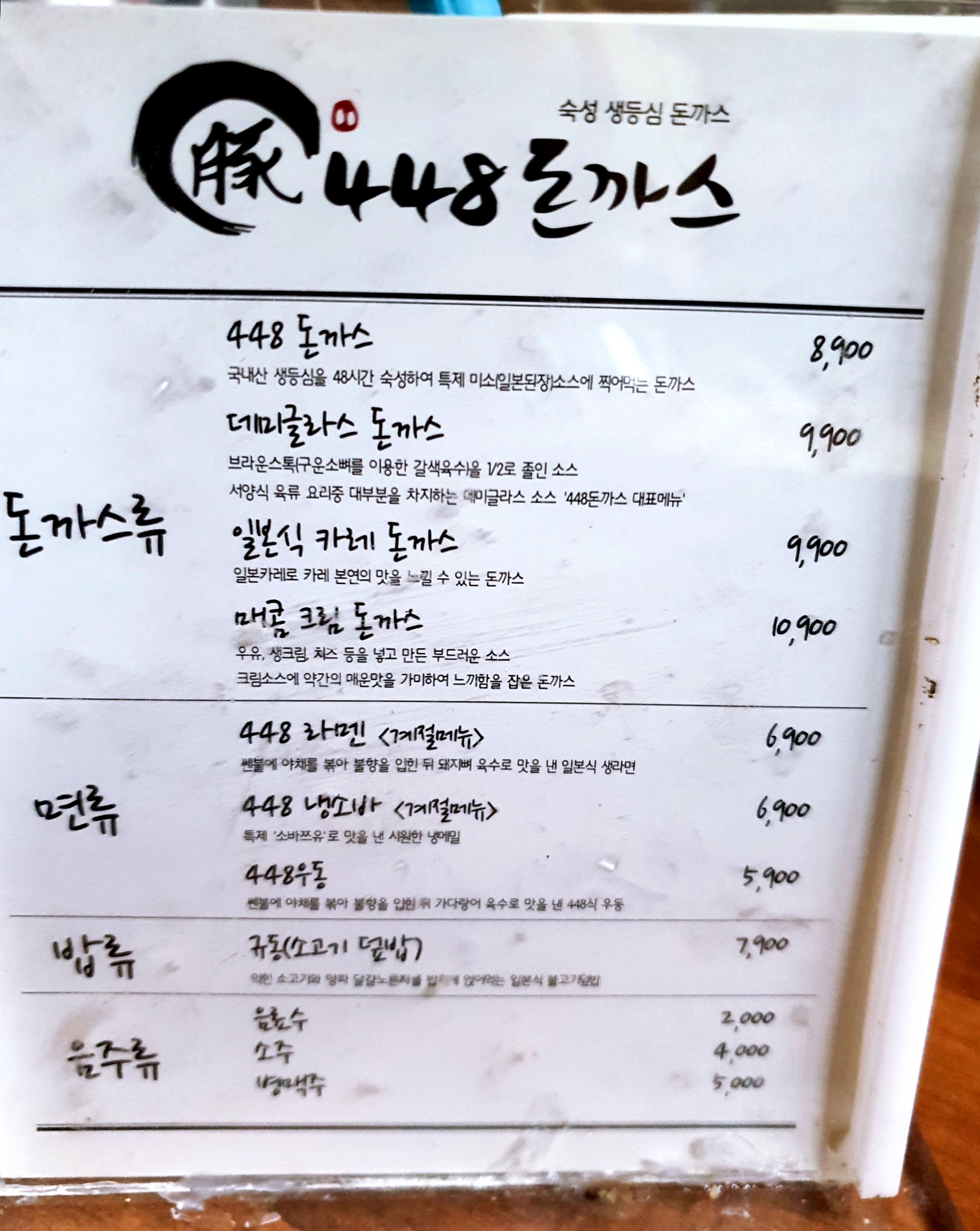 가격은 최근에 1,000원이 올랐더라고요. 그래도 물가 수준과 가게 위치를 생각하면 적정한 수준인 것 같습니다. 매콤크림 돈까스와 448 돈까스를 주문했습니다.