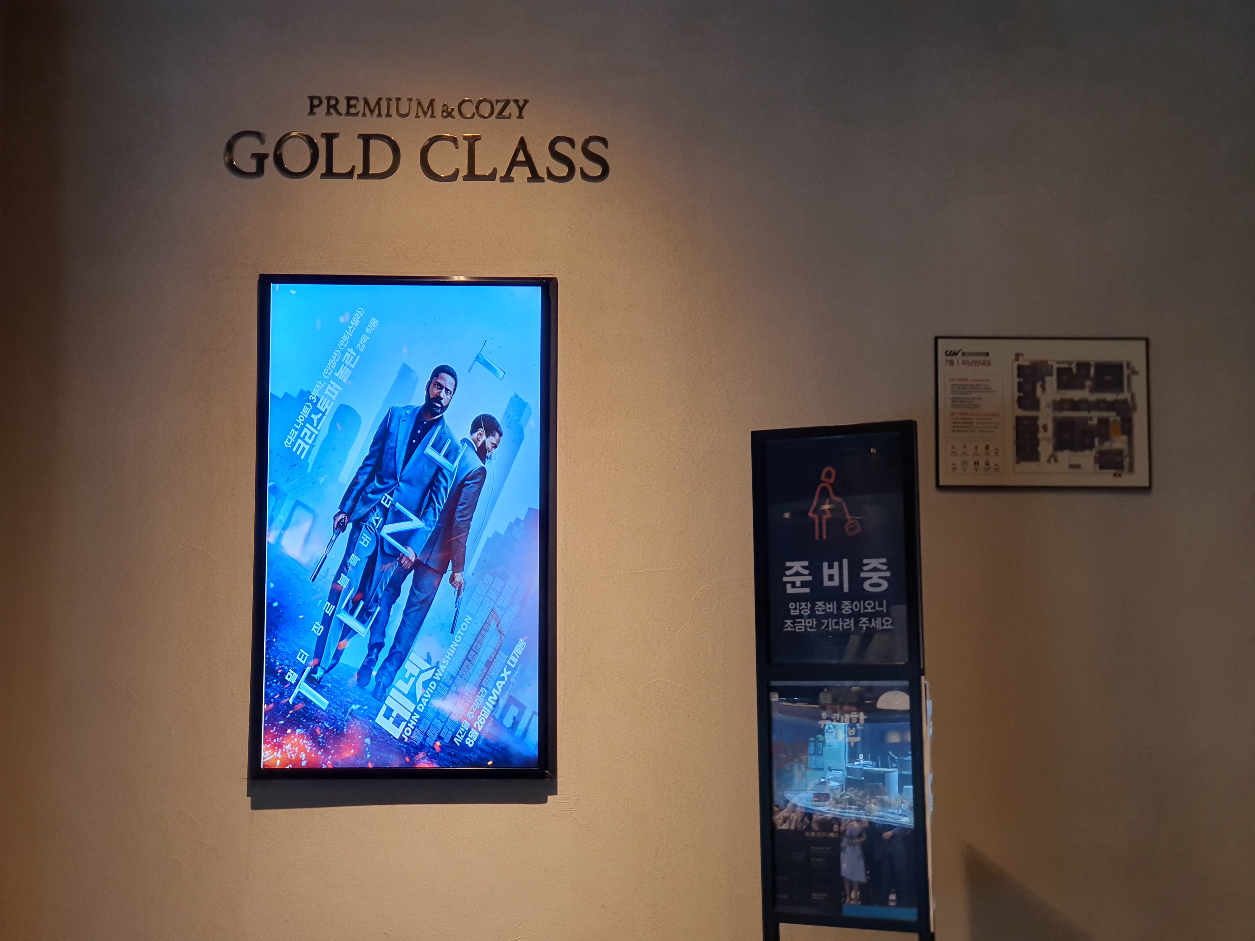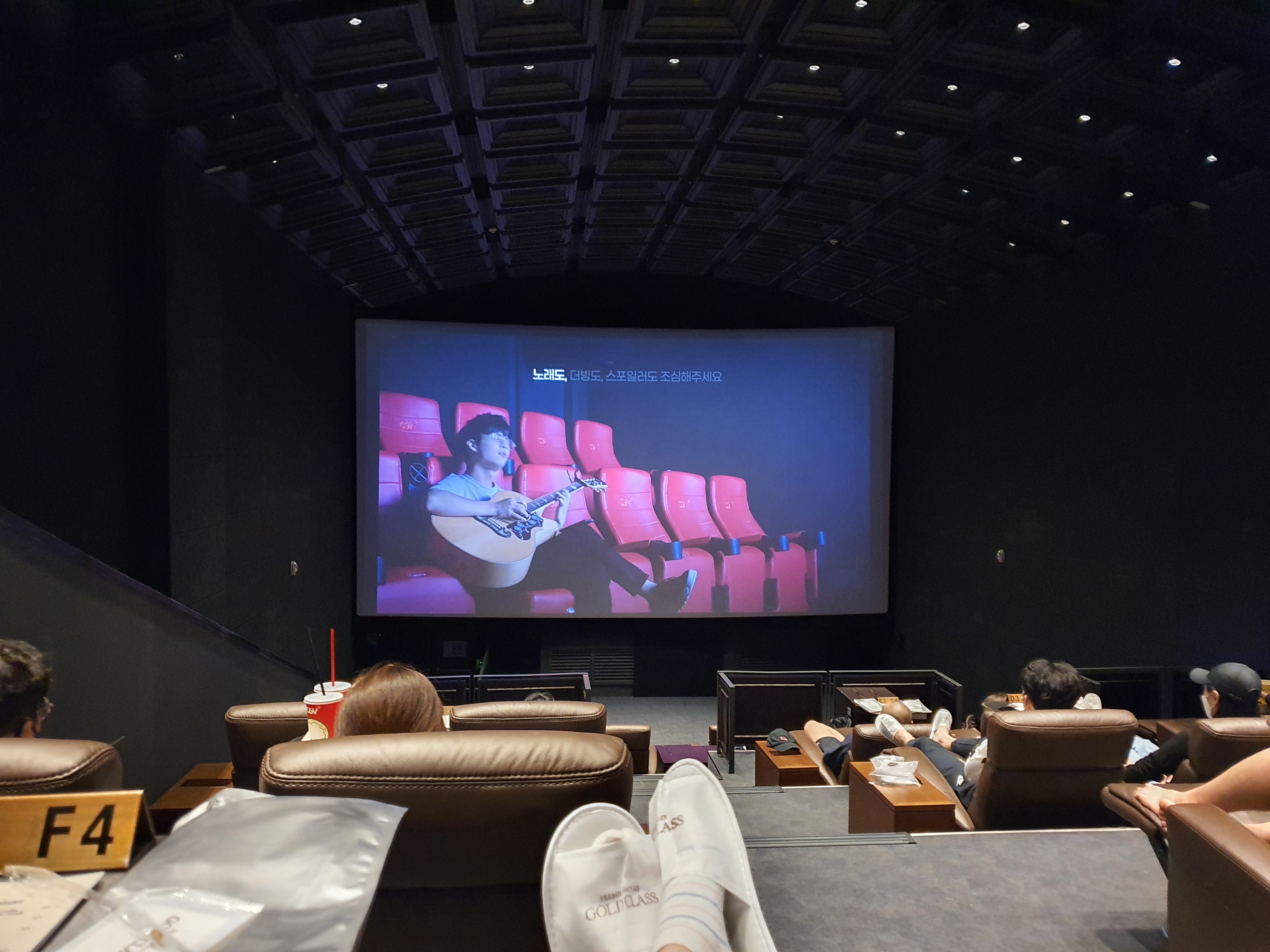 역시 골드클래스라고 광고가 없는 건 아니었어요. 스크린은 그다지 크진 않아서 조금 아쉬운 느낌도 있습니다. 테넷이 상영 시간이 좀 길지만, 리클라이너에서 보니 확실히 편하게 볼 수 있었네요. 다른 관람객의 불쑥 솟아오른 머리나, 뒷자석에서 발로 찬다거나 하는 불쾌함을 겪지 않아도 되고요.