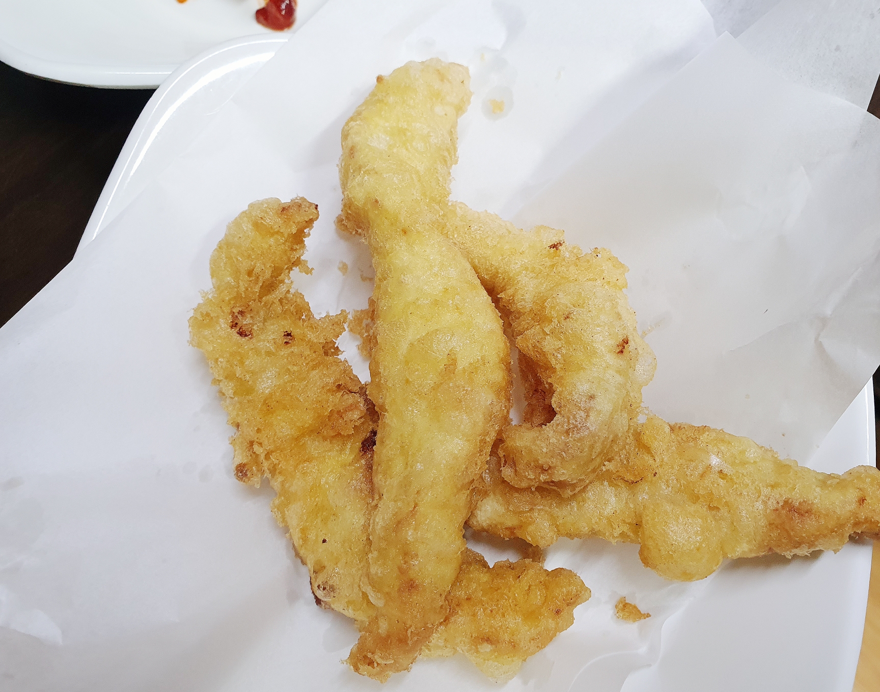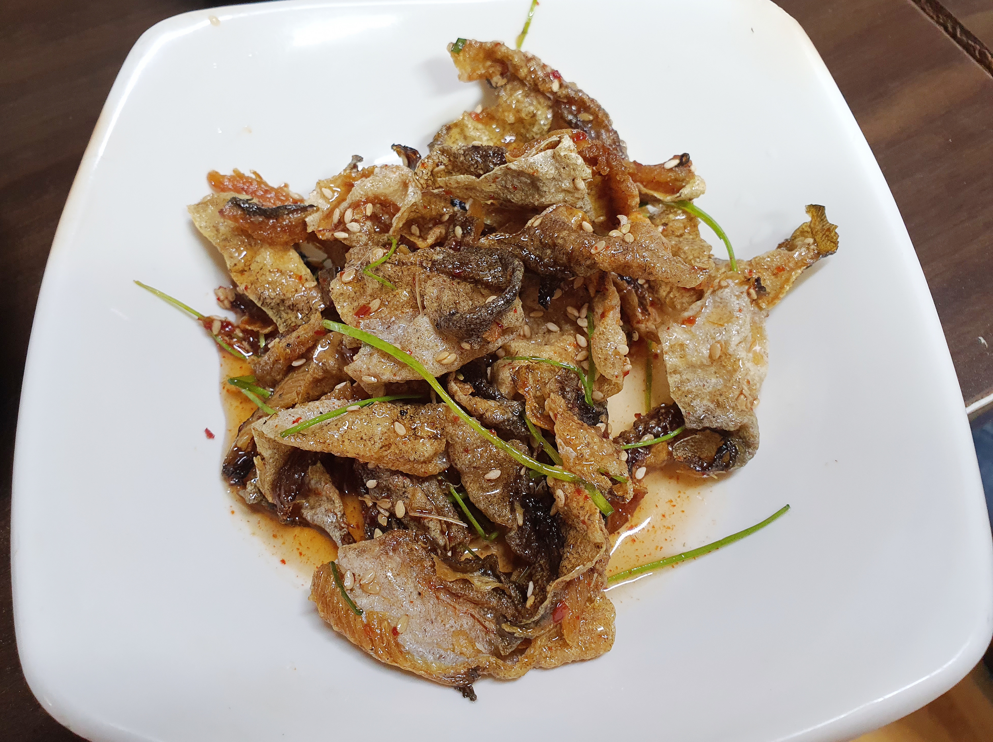 이번에는 껍질을 튀겨서 무친 음식입니다. 이것도 참 맛있었어요. 시간이 조금 지나면 눅눅해지기 때문에, 나오자마자 빨리 드시는 게 좋을 것 같아요.