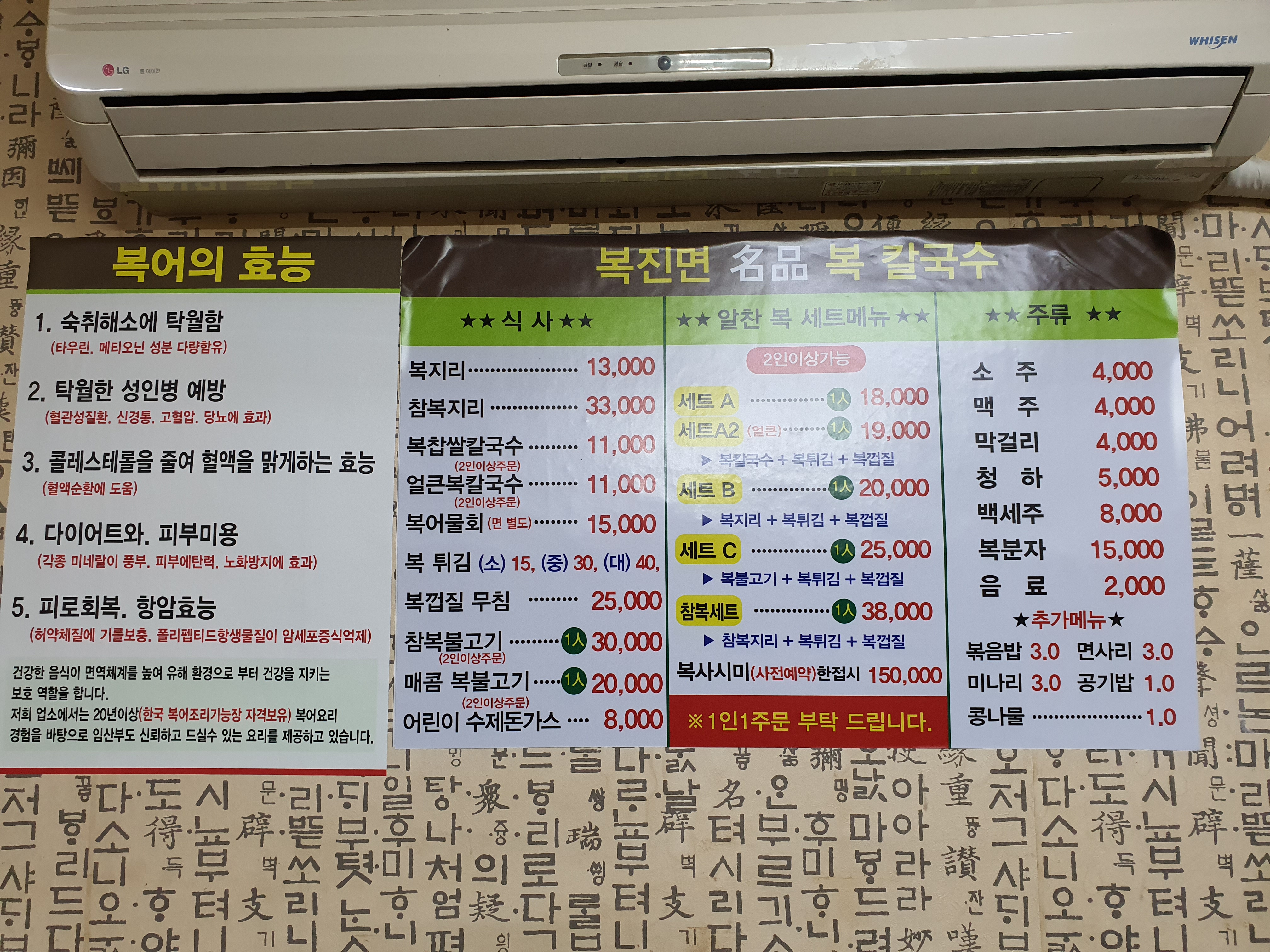 저희는 칼국수를 먹고 싶었기 때문에 메뉴는 세트A와 세트A2를 섞어서 주문했습니다. 칼국수 국물을 맑게 or 얼큰하게 끓이느냐의 차이만 있어요. 복지리도 맛있다고 하던데, 다음에 오면 복지리를 먹어봐야겠습니다.