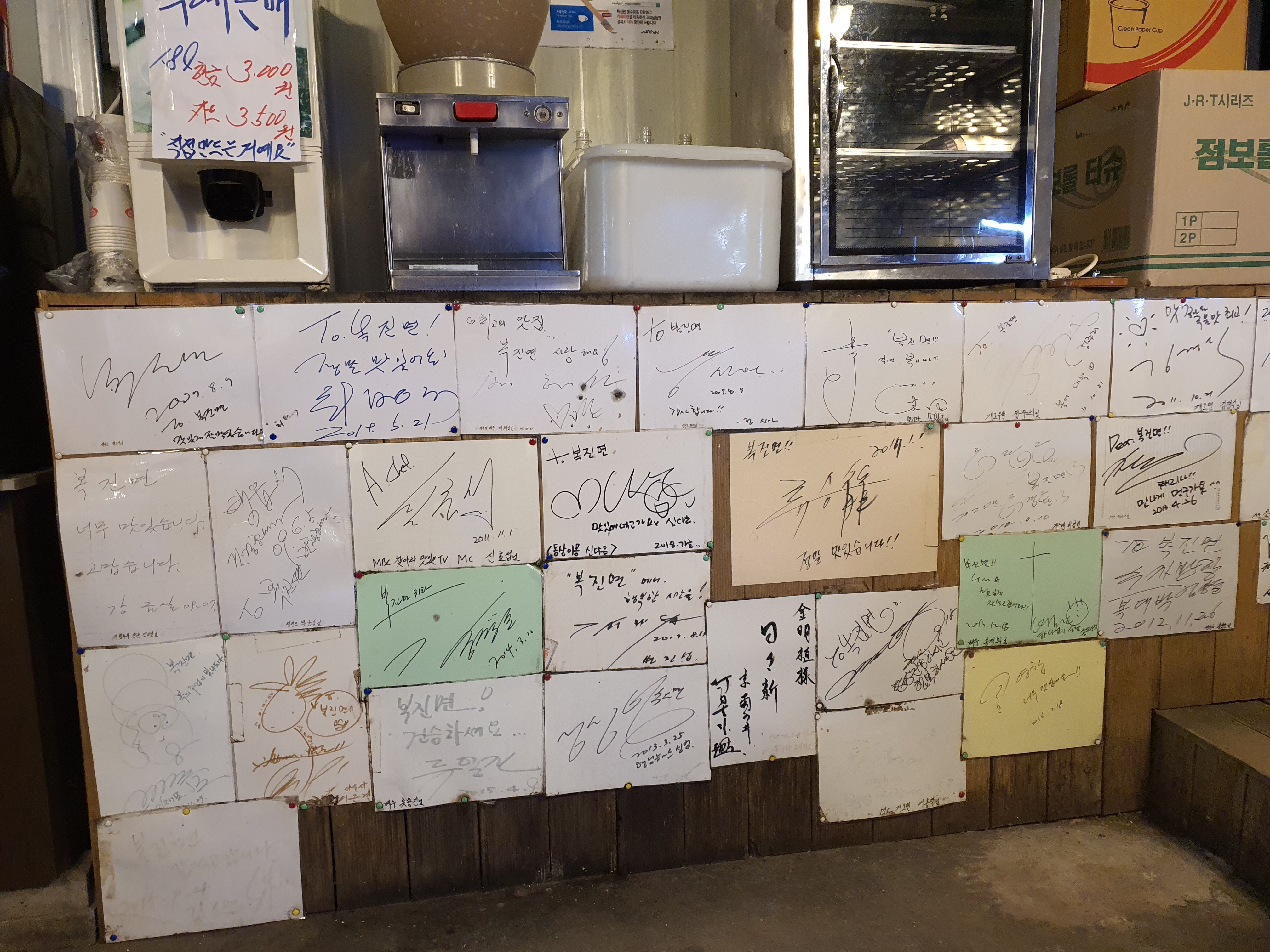 10년이 넘은 유명 음식점답게 유명한 연예인들의 방문 인증 사인들이 많았어요. 다음에 또 방문하고 싶은 음식점이었습니다 :)