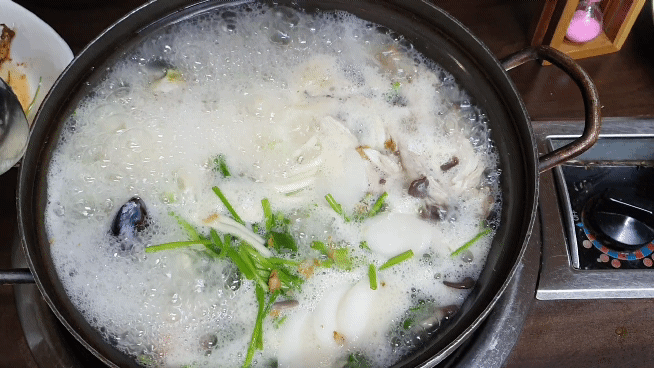 가스불을 켜고, 자리에 있는 모래시계를 뒤집어서 음식이 완성되기를 기다립니다. 모래시계 타이머가 끝나면 맛있게 먹으면 됩니다.