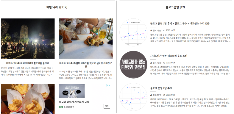 - 카테고리 별 목록 스타일을 각각 다르게 설정하였습니다. 예를 들어, 여행 카테고리는 사진이 좀 더 부각되도록 했습니다.
